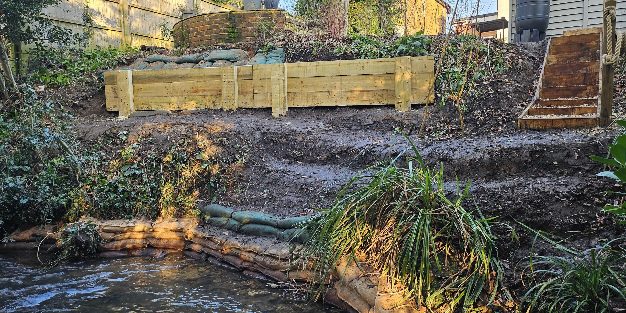 This project addressed the challenge of a stream bank that was eroding due to underlying structural issues. The site presented minimal access, requiring a careful and sensitive approach that respected the surrounding environment. Our solution ensured both structural stability and a landscaped finish.